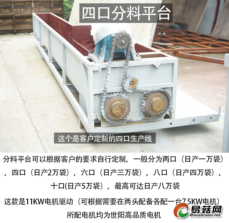 自动菌袋生产流水线,日产1-8万包,由搅拌机(一级搅拌,二级搅拌),上料机(2.5米,可改长度),布料机(一个口单独提升机,2-8个双螺旋布料口),电器控制柜,装袋机(电磁装袋机或智能防爆筒装袋机自选。)等组成。可量身定制,也可选择分开订购。整套设备高效、智能,具有自动拌料,连续拌料,自动分料,自动装袋儿的功能。运行稳定,操作简单,维护方便,搅拌出来的基料均匀,装出来的菌棒均匀光滑,无微孔。特别适用于中等规模以上,ManBetX体育专业合作社,大中型工厂化ManBetX体育生产基地使用。