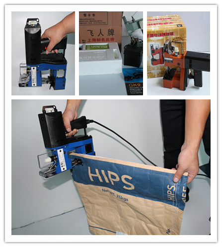 9、在缝包机工作中,如出现编织袋卡住压板或机针现象,不要硬拉机器以防损坏机器,而要用刀割断,清理干净检查后再使用。