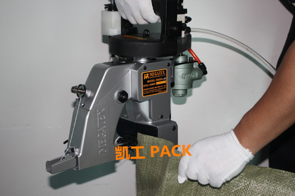 2、首先需要一台3匹马力,80升以上气罐,出气前端需要加装油水分离器设备才能开始使用,5*8mm管径链接气动缝包机就可以开始缝袋使用了,只需要将袋料口放入气动缝包机送料牙位置按缝包机启动键即可开始缝袋。