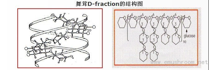 舞茸地复仙是舞茸的主要活性成份--(舞茸D-fraction)中文名叫舞茸地复仙,舞茸中含有以β-(1-6)结合为主链β-(1-3)结合为侧链的葡聚糖和以β-(1-3)结合为主链β-(1-6)结合为侧链的葡聚糖,实验证明这些活性葡聚糖可通过活化免疫功能而显著抑制肿瘤的生长;同时还发现纯化的活性葡聚糖只有通过注射才能显效,而舞茸D-组分(活性葡聚糖和蛋白的结合物)通过口服便可得到理想的效果。舞茸D-组分无论是化学结构和组成成分或是分子量都有别于从香菇、云芝、灵芝等其他菇类提取的同类物质,其生物活性也是这些同类物质所无法比拟的。