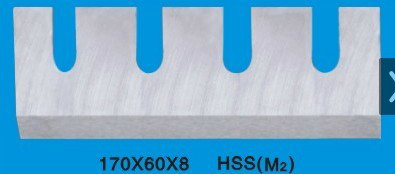 上图刀为170毫米长,宽有60毫米的四槽和70毫米宽的三槽等。可以定做的。厚度目前为8毫米。可以为客户定做10或12或15等厚度,但要求量要大。当然,我们还可以为客户定做更长的刀片的。还有180长70宽三槽、260长、300长等规格。只要数量多,我们都可以定做。刀片中的所镶的锋钢在同行中是我们的最宽或最多了,锋钢中所含钨的成份没有偷工减料是选用最好的材料。因此当进行修磨刀片后(修磨刀机我们正在研制,已经有出货。但成本还是高。)所使用的次数也是同行中最多的了。相对而言就是我们的刀片寿命最长了。如果平均计算,就算是贵些也是用我们的成本低。亲,还是买好的刀片贵得有所值吧。刀片中的镶锋钢宽度请看下文的介绍或首栏中的“公司相册”中的刀片集照片吧。