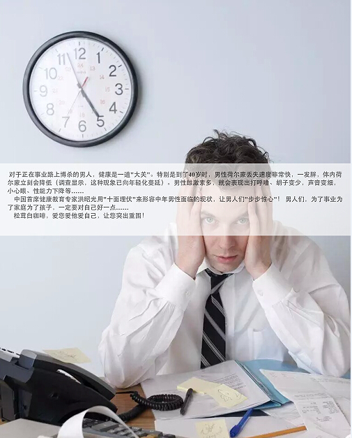 对于正在事业路上博杀的男人,健康是一道"大关"。特别是到了40岁时,男性荷尔蒙丢失速度非常快,一发胖,体内荷尔蒙立刻会降低(调查显示,这种现象已向年轻化蔓延)。男性雌激素多,就会表现出打呼噜、胡子变少,声音变细,小心眼、性能力下降等……
