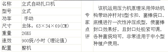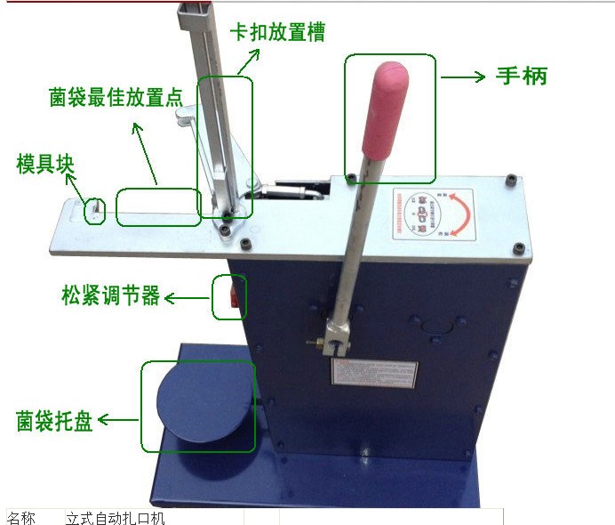 原先生产10000段菌棒,用建新扎口机只要1-2个民工就可以完成。用建新扎口机密封性好,菌棒又不容易因漏气而受到杂菌感染。此款扎口机做工精致,操作简单,使用简单,移动方便,经久耐用,不用动力不用电,手柄操作,快慢自如,使用者的人身安全有保障。主要适用于香菇、金针菇、平菇、木耳等的打穴接种的菌类品种的扎口作业,自动送钉,效率高,扎口气密性好,适用于菌种及栽培料袋的袋口捆扎作业,工作效率是手工的3-5倍,且捆扎后的菌袋气密性好,彻底解决手工扎口质量差,工效低的难题。卡扣扎口,20以下用U503型号卡扣卡钉。20以上的用U506卡扣。扎口用卡扣的铝材采用高强度铝镁合金,硬而不脆,不生锈.扎口紧,不漏气.菌袋扎口机可以给规格为:15*55的地栽菇袋/17*33金针菇袋/24*45平菇袋/18*58/20*60/21*61/22*62/23*63香菇栽培袋、菌袋扎口作业,每1~3秒可以扎一个菌袋,将手工扎口效率提高8~10倍.