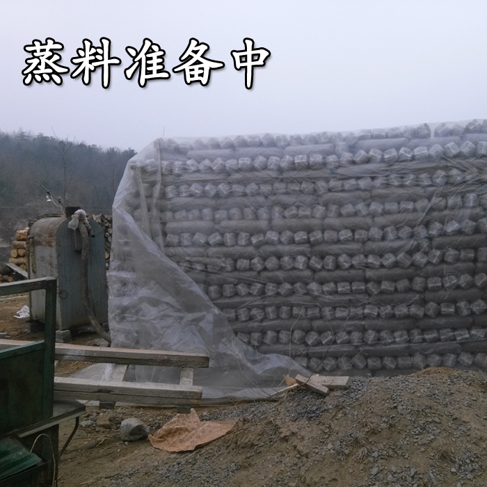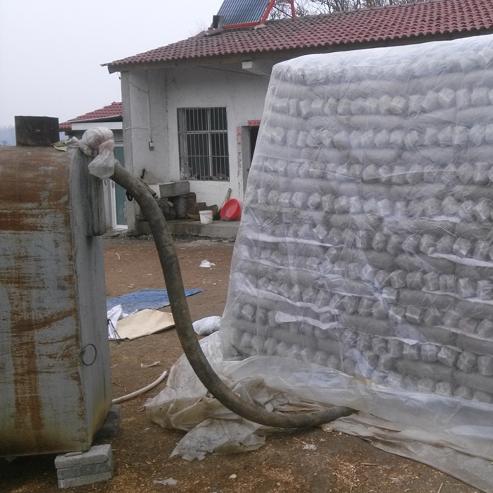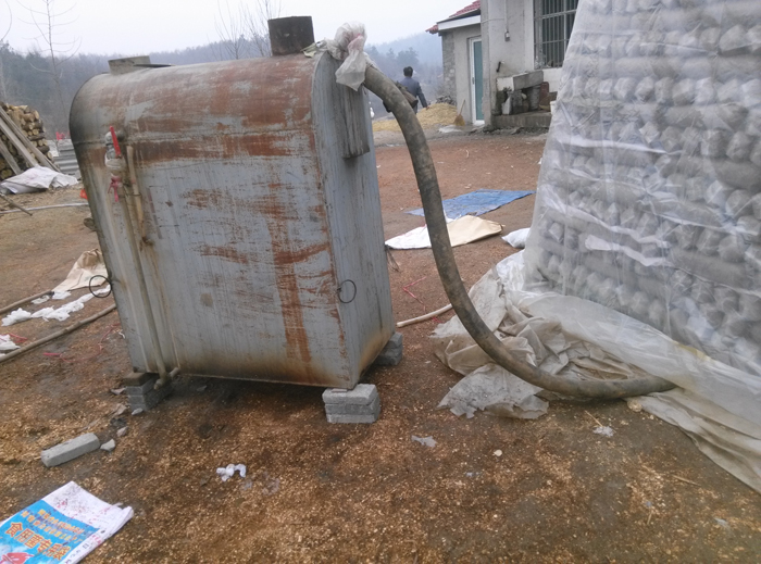 九、把常压灭菌锅炉放到距菌垛一米左右的地方,在锅炉底部垫两层砖,其意是抬高锅炉,利于通风和清除炉渣。然后把蒸汽导管接好,一头插进菌垛底部(木杠以下),不要插进去太深,以20cm-30 cm为宜。要注意使导汽管口平伸,不要向上跷或向下跷。