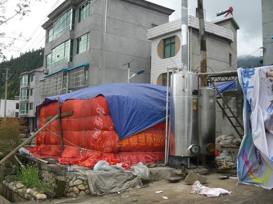 九、把常压灭菌锅炉放到距菌垛一米左右的地方,在锅炉底部垫两层砖,其意是抬高锅炉,利于通风和清除炉渣。然后把蒸汽导管接好,一头插进菌垛底部(木杠以下),不要插进去太深,以20cm-30 cm为宜。要注意使导汽管口平伸,不要向上跷或向下跷。